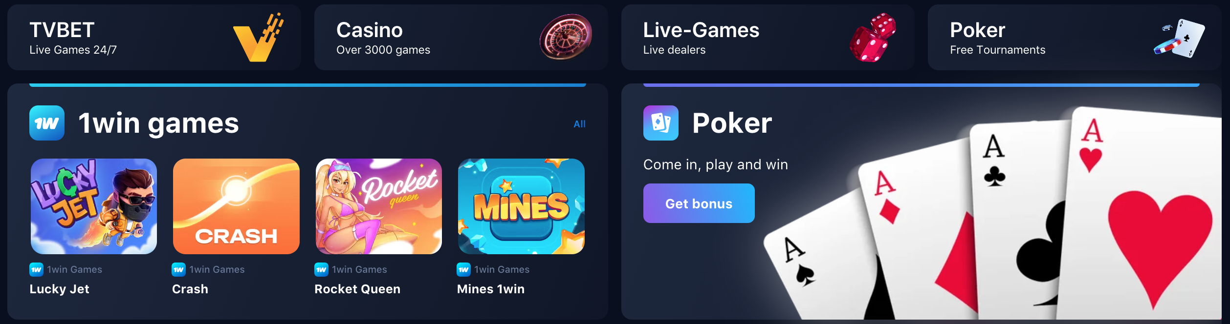 Īpašu popularitāti pēdējā laikā ir ieguvušas tā sauktās ātrās jeb "crash" spēles, un 1win piedāvā plašu šāda veida izklaižu klāstu. Populārākās no tām ir Aviator, Lucky Jet un Speed-n-Cash. Šajās spēlēs spēlētāja galvenais uzdevums ir laikus izņemt savu likmi, pirms spēles objekts (piemēram, lidmašīna vai raķete) pazūd no ekrāna, kamēr reizinātājs turpina augt. Šajā sadaļā atradīsiet arī citas ātrās izklaides, piemēram, momentloterijas (nokasāmās kartītes), keno un bingo spēles.